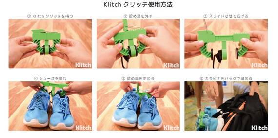 使い方 1.Klitch クリッチを持つ 2.留め具を外す 3.スライドさせて広げる 4.シューズを挟む 5.留め具を閉める 6.カラビナをバックで留める