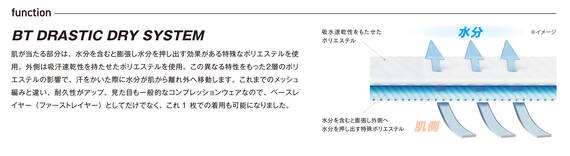 肌が当たる部分は、水分を含むと膨張し水分を押し出す効果がある特殊なポリエステルを使用。外側は吸汗速乾性を持たせたポリエステルを使用。この異なる特性をもった2層のポリエステルの影響で、汗をかいた際に水分が肌から離れ外へ移動します。