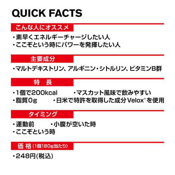 ゼリー1個(180g)で、おにぎり1個分の200kcalを補給することができ、エネルギー源には、マルトデキストリンという消化吸収に優れた糖質を使用。